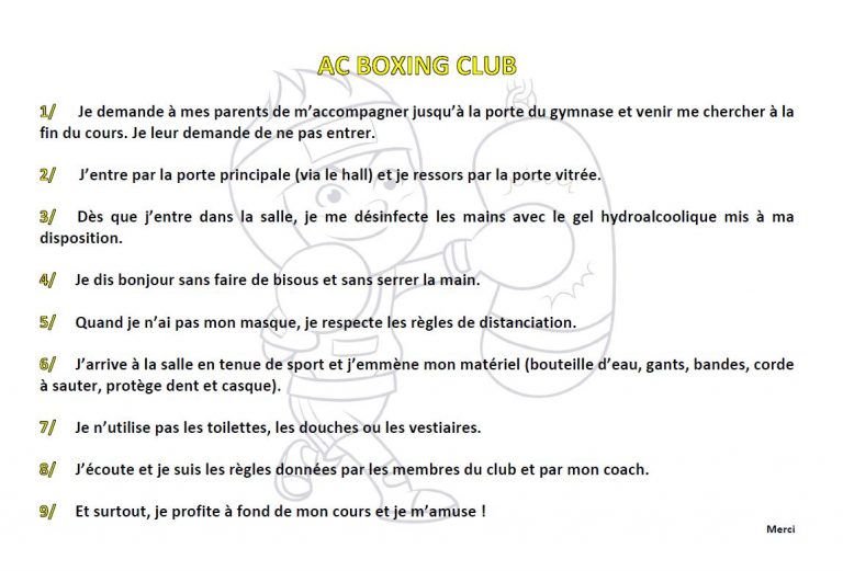 – Chèque à l’ordre de AC Boxing Club (montant communiqué lors de l’inscription)